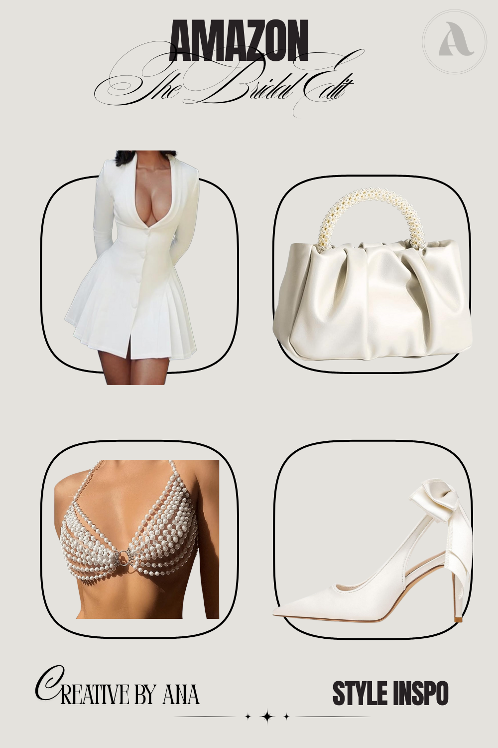 An elegant deep V-neck blazer mini dress with sharp pleats and luxe button details sets the tone for refined sophistication. Paired with satin stiletto heels adorned with delicate bow ties, the look stays bridal yet fashion-forward. Add a soft pearl-beaded clutch or ruched mini bag for a touch of romance, and finish with a pearl halter bikini top for the bride who loves a daring, playful statement. It’s the perfect blend of bold modern femininity and timeless bridal elegance.