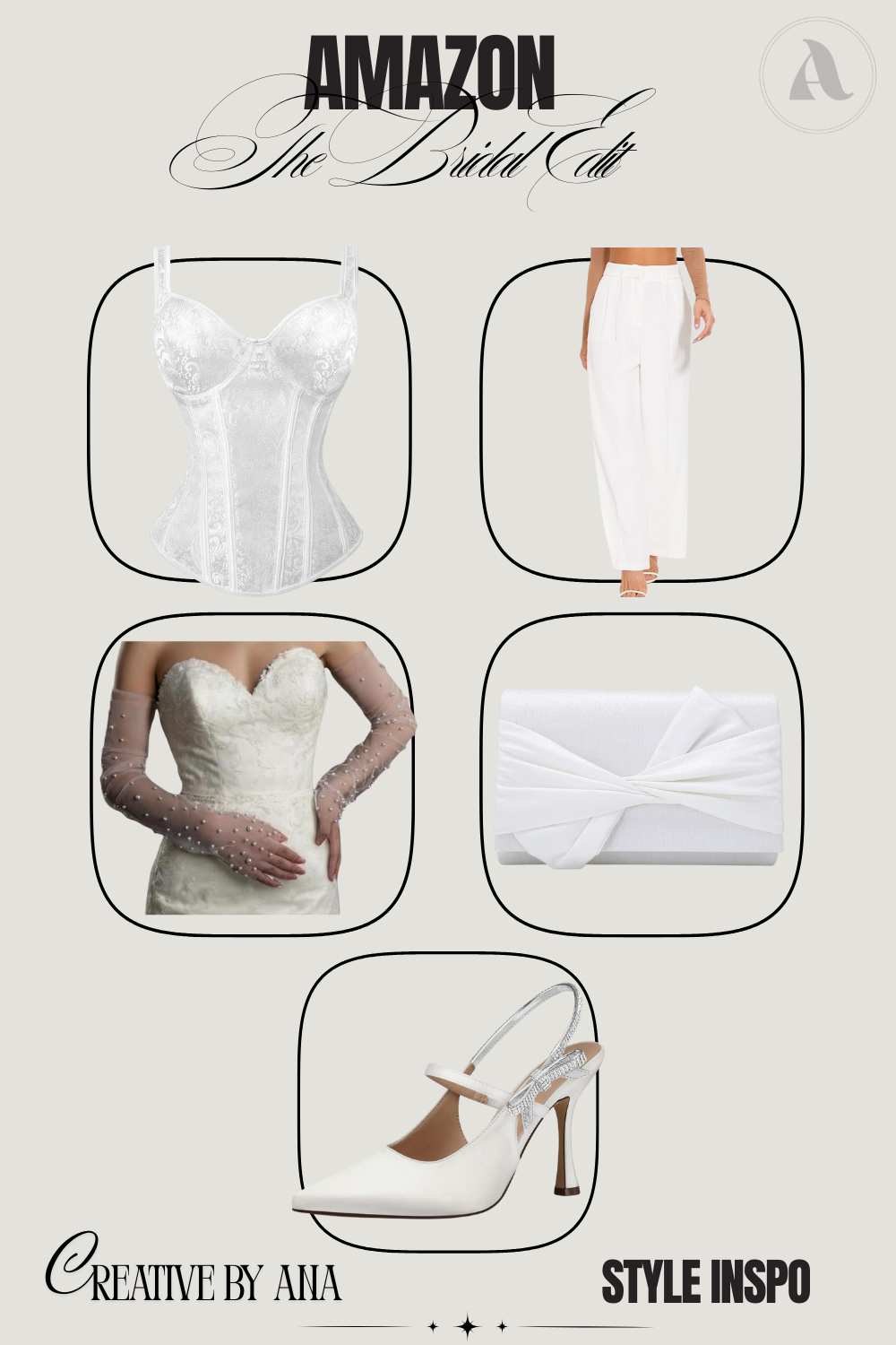 A structured tank overbust corset paired with sleek long straight-leg suit trousers creates a look that’s both powerful and polished. Add a bow flap clutch for a hint of feminine charm, while long pearl-detailed tulle gloves soften the edges with a romantic bridal touch. Finish with rhinestone bow stiletto heels to bring sparkle and sophistication — the perfect balance of modern tailoring and timeless bridal allure.