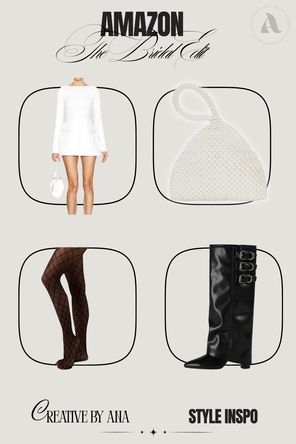 Think knee-high boots with chunky heels paired effortlessly with a curve-hugging bodycon mini dress, softened by delicate side bows. Add sheer women’s tights and finish the look with a pearl clutch purse for just the right balance of subtle elegance and bold femininity. It’s a statement ensemble that turns heads while keeping the details refined and chic.